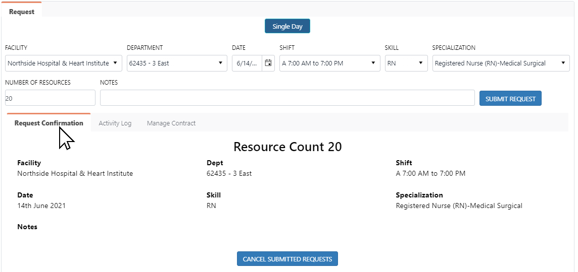 Once requests are submitted, a confirmation message displays in the screen header and the Request Confirmation tab displays the request details. If you wish to cancel the request, you may do so by clicking the Cancel Submitted Requests button.