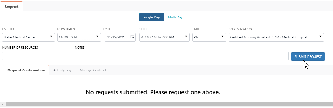 Bulk Contract Labor Single Day Request Screen